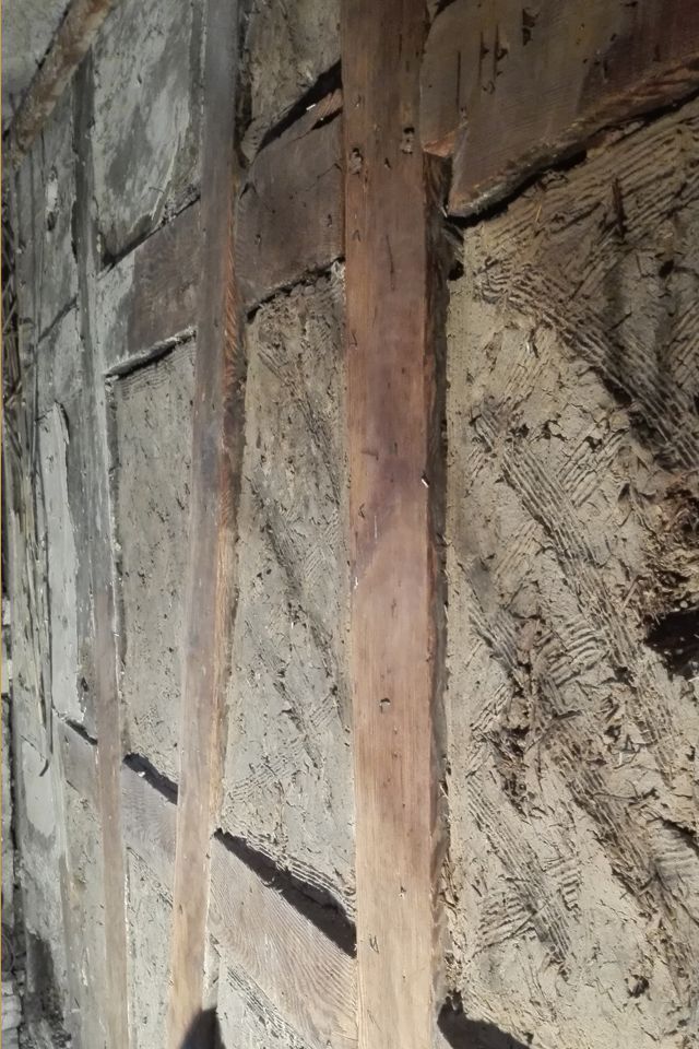 Z ciekawością obserwowaliśmy stan konstrukcji budynku, tym bardziej, że z trzystuletnim szachulcem mieliśmy pierwszy raz do czynienia. Okazało się, że te drewniane rygle, które izolowane były materiałem podobnym do papy uległy całkowitej degradacji. Najprawdopodobniej było to skutkiem braku wentylacji konstrukcji.