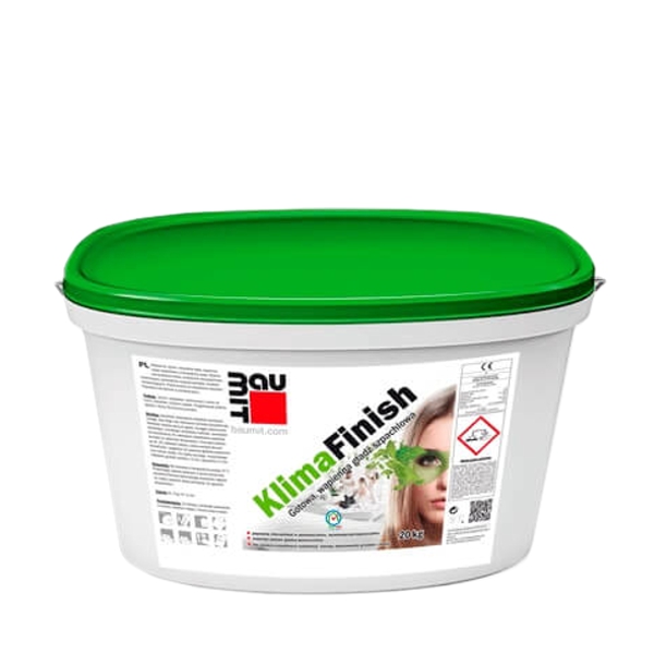 Wysikiej jakości, gotowa do użycia, naturalnie biała, wapienna gładź szpachlowa Baumit KlimaFinish. Bazzapachowa, bezemisyjna i pozbawiona rozpuszczalników oraz środków konserwujących. Podobnie jak KlimaFino jest wysokoparoprzepuszczalna i poprawia mikroklimat w pomieszczeniach.